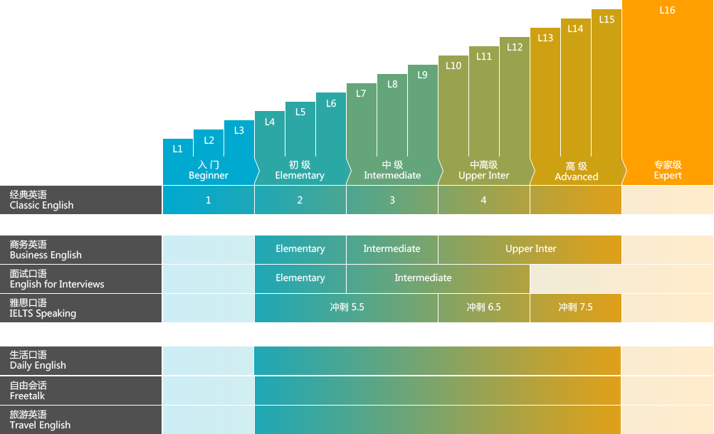 来自全球的拥有超过10年教学经验的专业教研团队,依照欧洲语言共同框架(CEFR),精心打造的更适合中国英语学习者的课程体系,听说读写全面覆盖的教学内容,实用而有趣的教材设计针对不同阶段学员水平,从零基础入门到精通的16个级别的英语晋升阶梯,正在等待你的攀升!